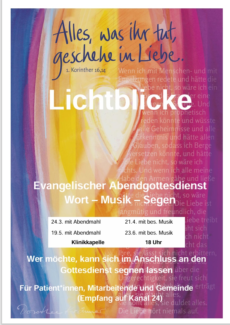 In der Klinikkapelle findet am 21.9. ein Abendgottesdienst mit Abendmahl um 18 Uhr statt.