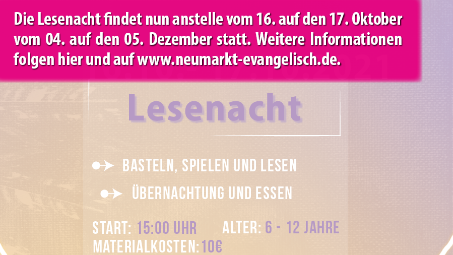 Neuer Termin! Unsere Lesenacht findet nun anstelle vom 16. auf den 17. Oktober am ersten Dezemberwochenende vom 04. auf den 05. Dezember statt.
