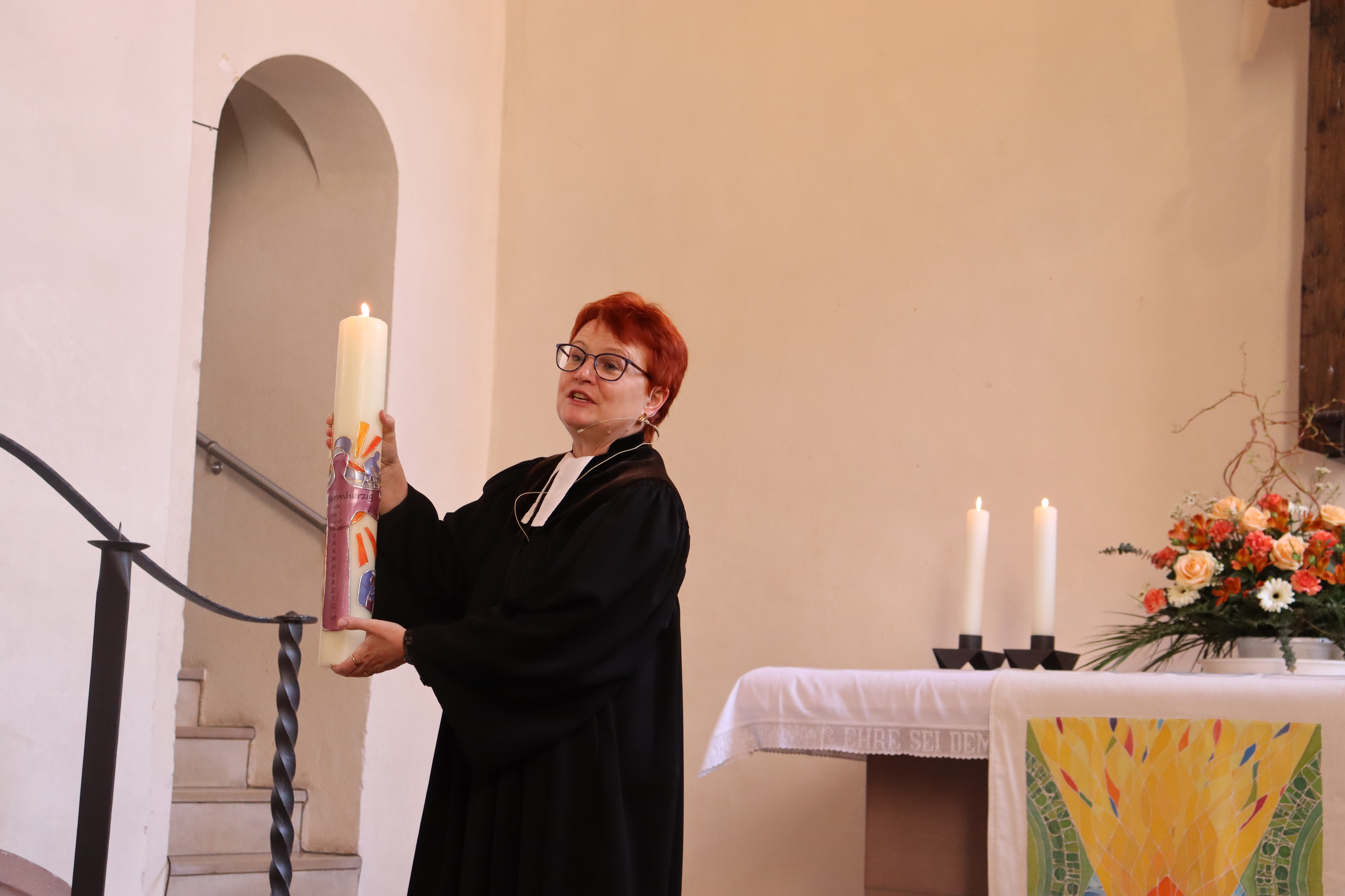 Jahreslosung schmückt Osterkerze: „Seid barmherzig, wie auch euer Vater im Himmel barmherzig ist.“