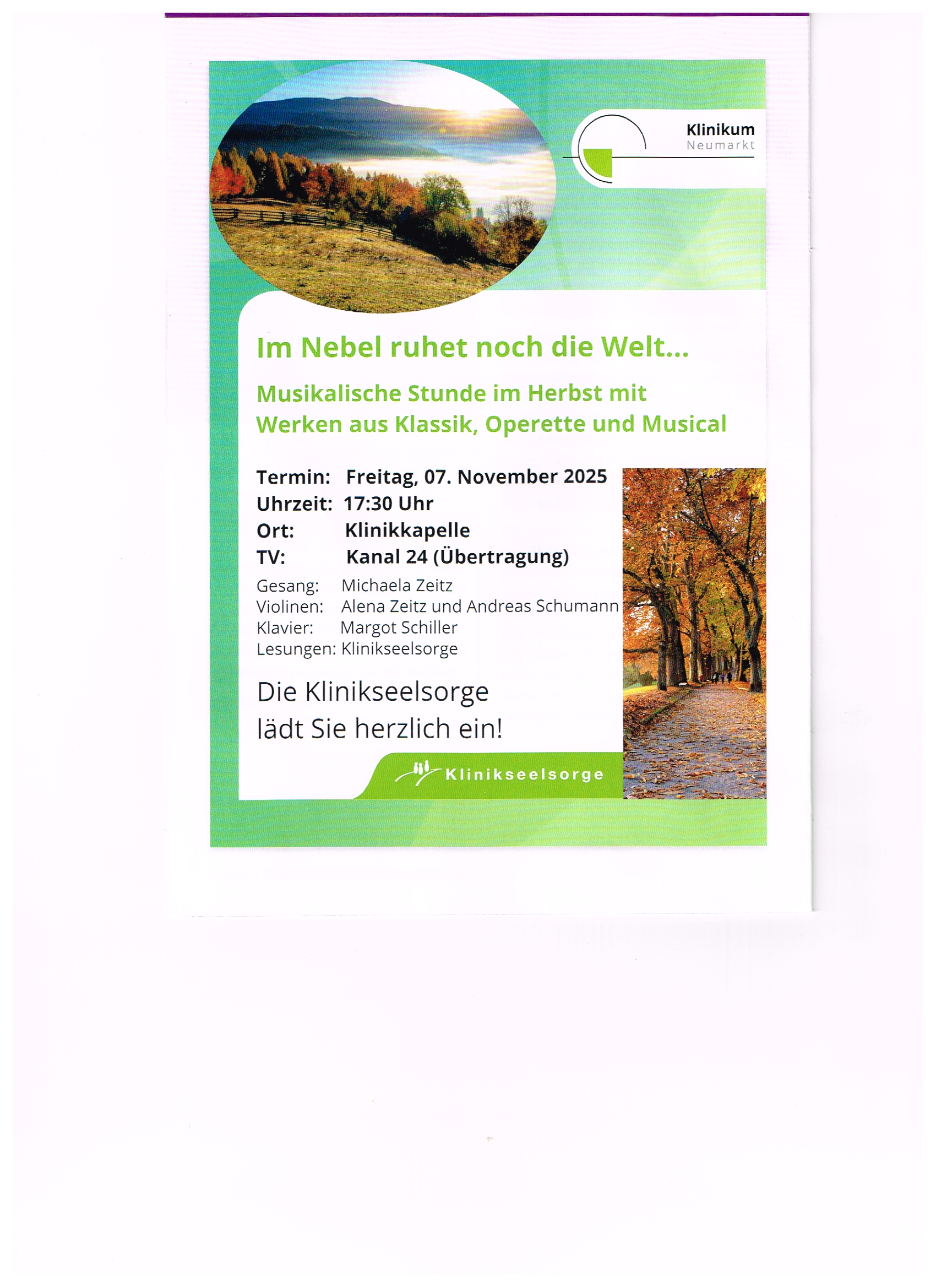 Die Klinikseelsorge lädt zu einem Herbstkonzert am 7. November um 17.30 Uhr in die Klinikkapelle ein.