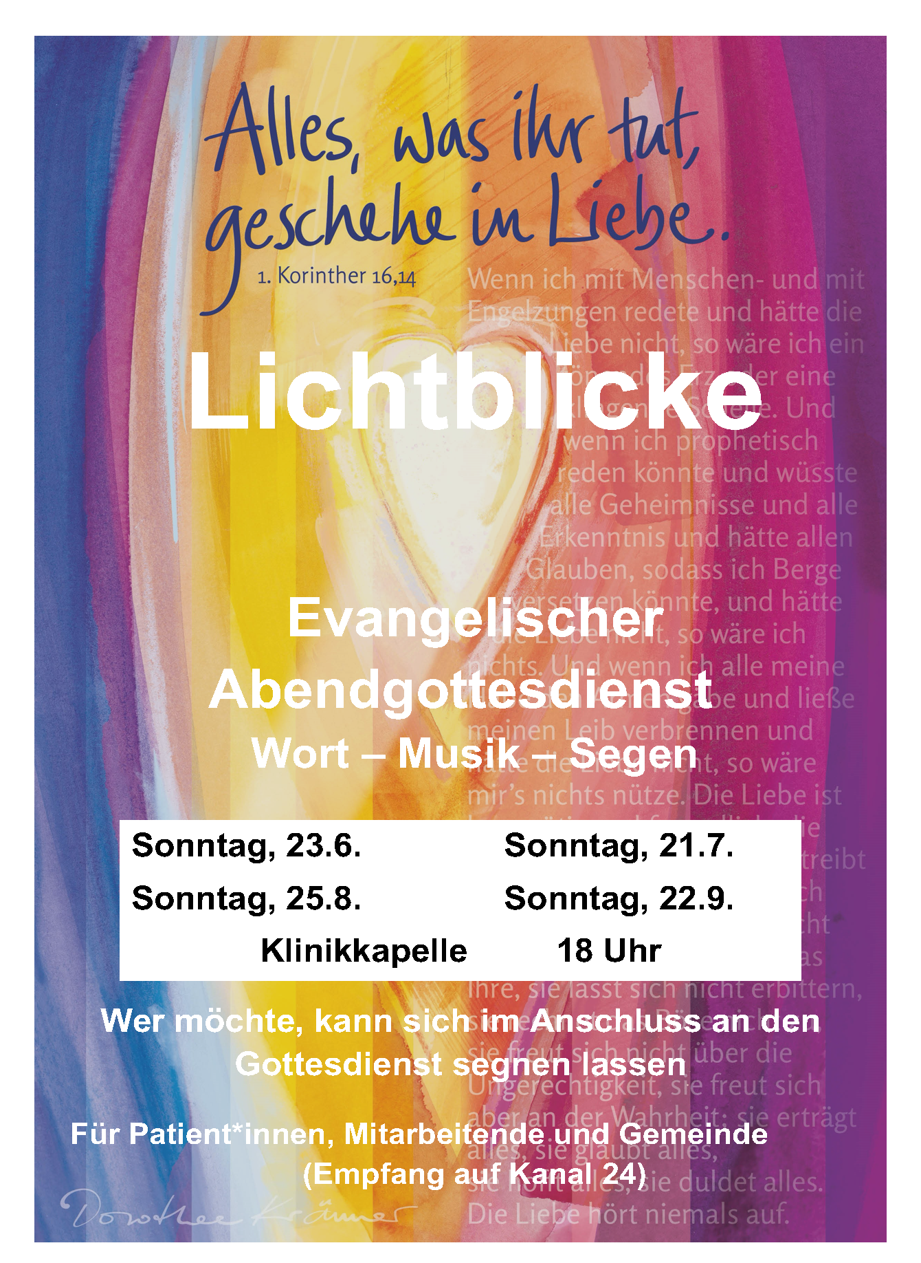 Herzliche Einladung zum Gottesdienst in der Klinikkapelle um 18.00 Uhr. Es wird ein Gottesdienst mit besonderer Musik und der Möglichkeit, sich…