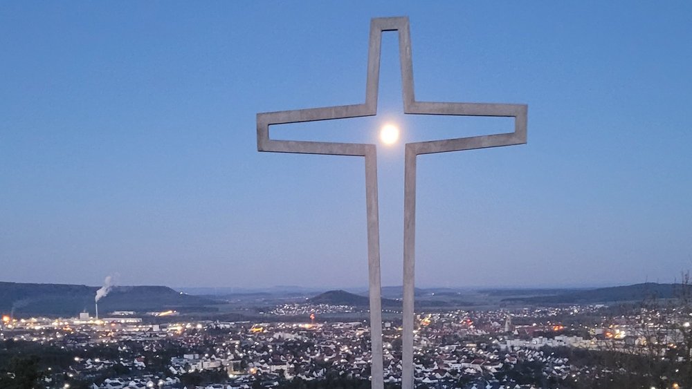 Erstmals Osternacht unter freiem Himmel beim Kreuz am Wolfsteinberg. Bilderstimmung vom Abendmahlgottesdienst mit Dekanin Murner, der Evangelischen…