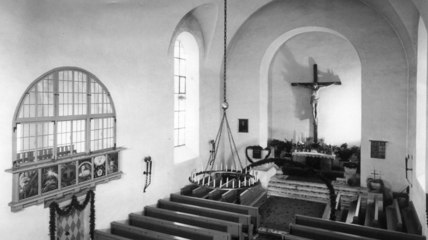 Das Wolfsteinsche Wappen in der alten Sakristei trägt das Datum des 75-jährigen Jubiläums der Kirchengemeinde: 30. Oktober 1932