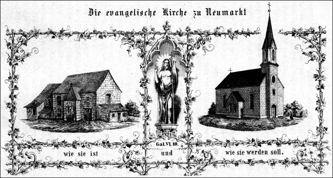 1854 konnte der mittlere Teil der ehemaligen Kapuziner-Kloster-Kirche erworben, und durch Spenden, auch von vielen Gemeinden und Einzelpersonen in Bayern, zu einem Gottesdienstraum umgebaut werden. Nach mehr als 230 Jahren fand bei der Einweihung am 16. Dezember 1855 erstmals wieder ein Evangelisch-Lutherischer Gottesdienst in Neumarkt statt. Erst 1857 erhielt Neumarkt einen königlich-bayerischen Vikar und wurde somit eine eigene Kirchengemeinde. Es wurde ein ständiges Vikariat in Verbindung mit einer protestantischen Schule errichtet. Die Amtseinführung von Gustav Steinlein, bisher Predigtamtskandidat und Privatvikar in Vohenstrauß, fand am 10. Mai 1857 statt. Der Vikar musste wöchentlich vier Stunden Religionsunterricht erteilen. Zu dieser Zeit hatte Neumarkt 4.000 Einwohner, 203 Personen waren evangelisch, darunter 106 Soldaten und 17 Angehörige.